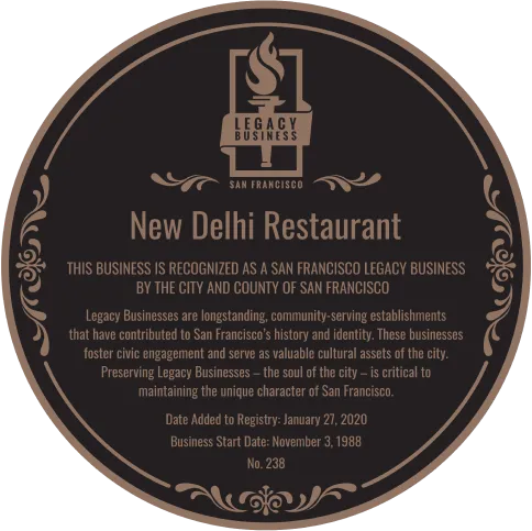 Today, this is the oldest Indian restaurant in San Francisco. It has been placed on the Registry of Legacy Businesses by the City of San Francisco. This is a rare honor, previously awarded to only 237 businesses throughout the history of the city. It is official recognition that the business is part of the very fabric of this unique city's cultural identity, its history, and community.